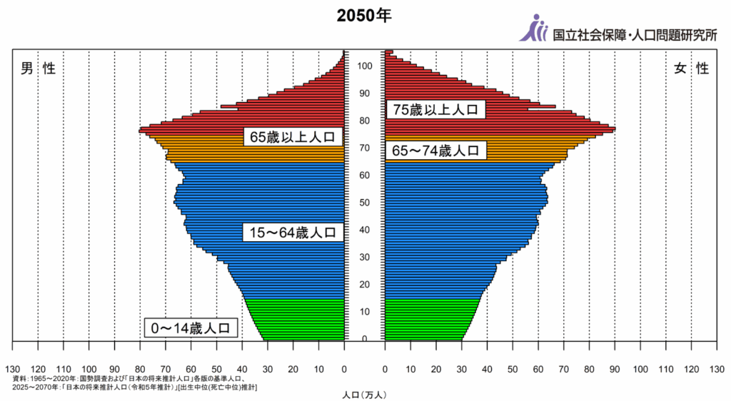 今年の人口ピラミッドと、2050年の予想人口ピラミッドを添付しました。