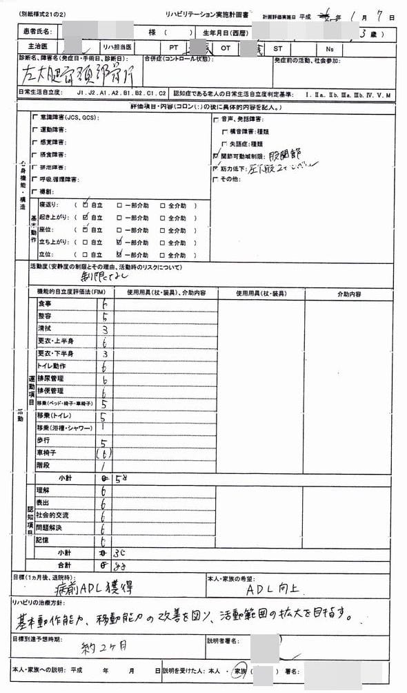 上の<リハビリ計画書>の目標欄に、「病前ADL獲得」「ADL向上」とあります。