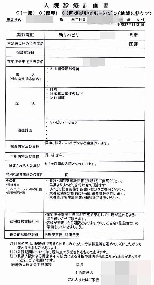 その際、一般病棟からリハビリ病棟への引き継ぎということで、同じ書式で、以下の<入院診療計画書>