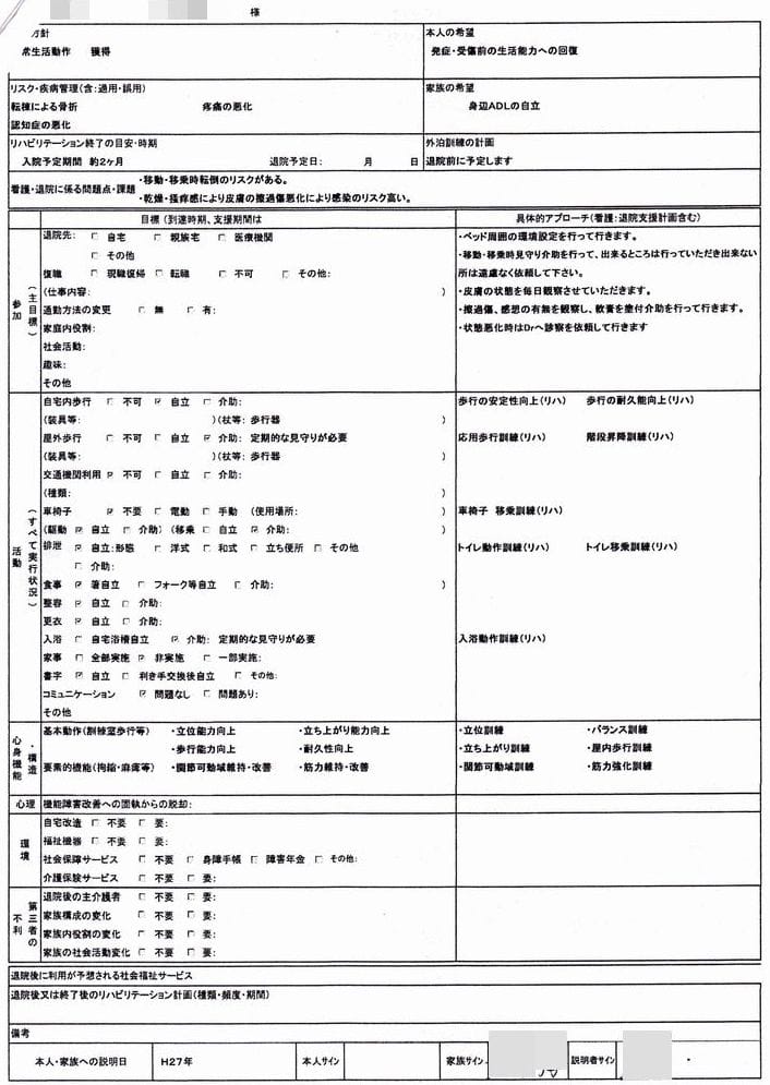 その日の内に、本人の状況を確認し、以下の様な評価表や計画書が作成され、説明を受けました。