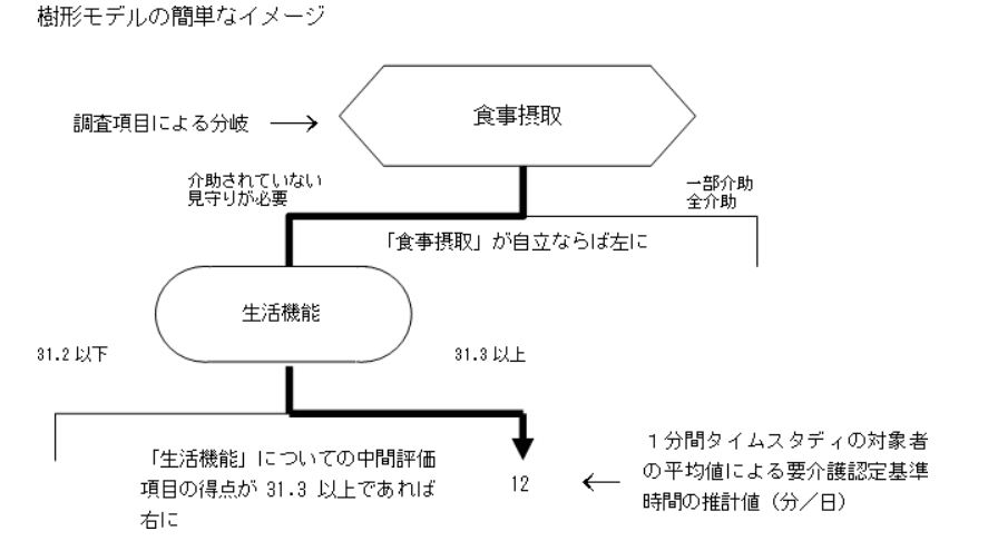 一次判定は、認定調査の項目等ごとに選択肢を設け、調査結果に従い、それぞれの高齢者を分類し、そのデータの中からその心身の状況が最も近い高齢者のデータを探しだして、要介護認定等基準時間を推計するシステムで、この方法は樹形モデルと呼ばれます。
