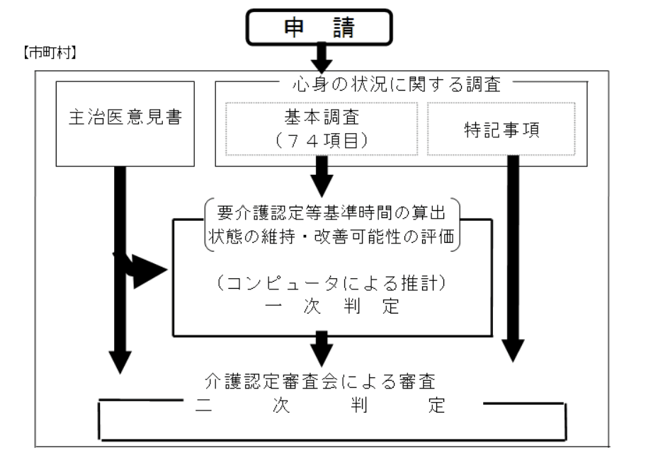 ・市町村の認定調査員(指定居宅介護支援事業者等に委託可能)による心身の状況調査(認定調査)及び主治医意見書に基づくコンピュータ判定(一次判定)を実施。