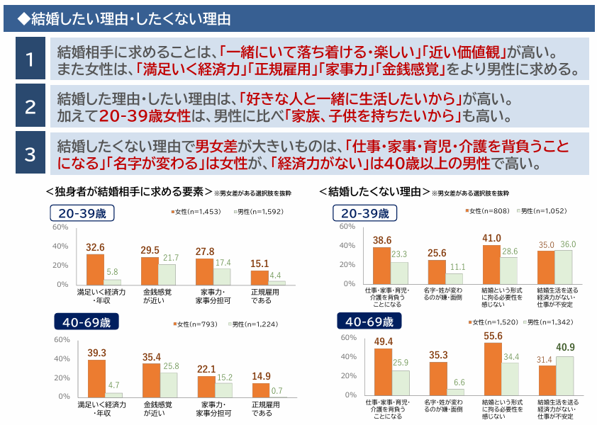 もう一つ、未婚率の高まりの要因を示す内閣府実施の「令和3年度 結婚等に関する調査」結果を紹介しています。